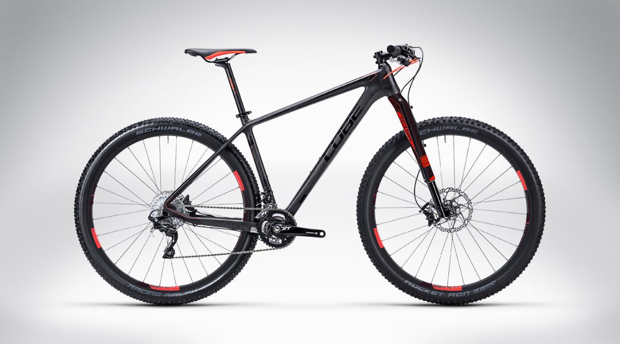 CUBE REACTION GTC SLT 29 ER, con cuadro de carbono y montada en XT. Horquilla invertida de rock shox RS1 de carbono.